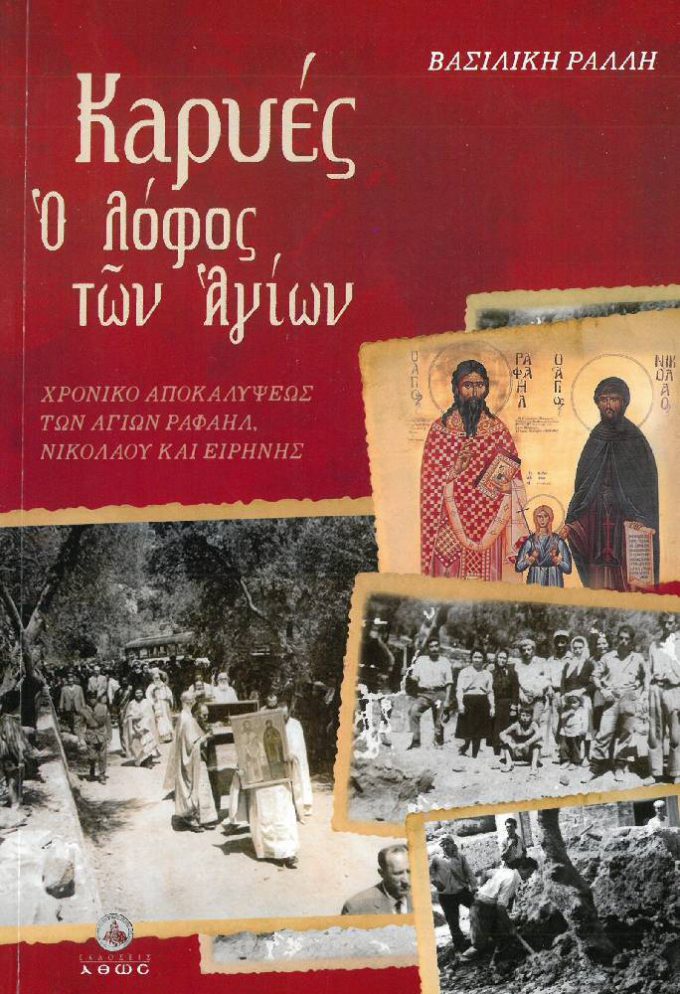 Ακριβώς στον λόφο εκείνο των Καρυών, όπου υπήρχε αρχαίο προσκύνημα της Παναγίας, κατά την εκσκαφή των θεμελίων του τάματος αποκαλύπτονται τα ερείπια της παλαιάς Μονής όπου έδρασαν οι τρεις Άγιοι και οι άλλοι μάρτυρες της παρούσης διηγήσεως. Κι απ’ εδώ αρχίζει η θαυμαστή και παράδοξη ιστορία των ενυπνίων, όπου οι Άγιοι υποδεικνύουν με ακρίβεια, καταρχήν στην συγγραφέα, αλλά και σε άλλους, απλούς ανθρώπους, κυρίως της Θερμής, τα λείψανα και τα μνημεία που θα αποτελέσουν την ιερή αφορμή της ιδρύσεως του μεγάλου προσκυνήματος της σημερινής Λέσβου: της Ιεράς Μονής των αγίων Ραφαήλ, Νικολάου και Ειρήνης.