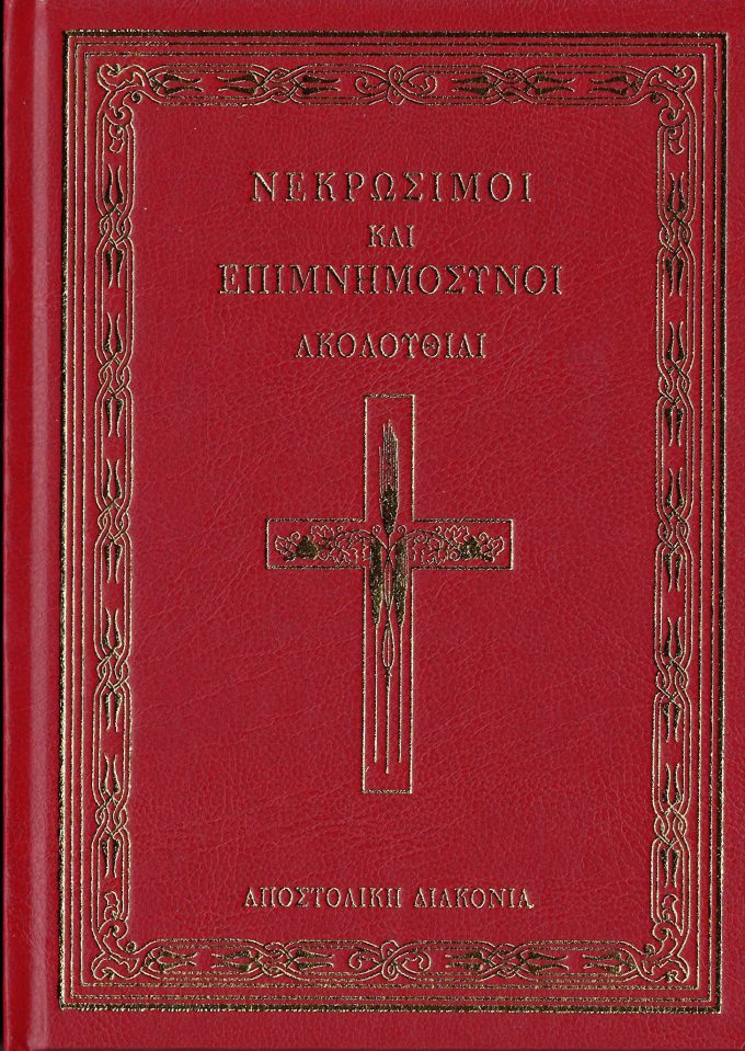 Εγκόλπιο με τις παρακάτω ακολουθίες: εις ψυχορραγούντα, νεκρώσιμη, σε κεκοιμημένους στη Διακαινήσιμο εβδομάδα, σε κεκοιμημένα νήπια, ταφή ετεροδόξων, νεκρώσιμο τρισάγιο, ακολουθία του Σαββάτου των Ψυχών, σε μνημόσυνο, σε πενθούντες.